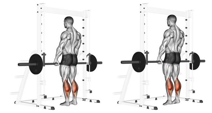 > Підйом на ікри з штангою в тренажері стоячи