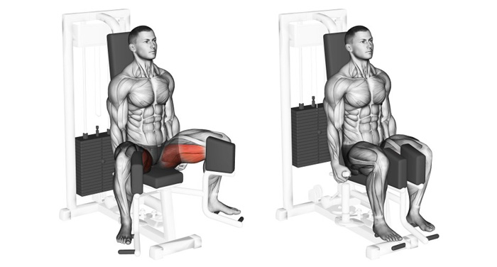 Розгинання ніг в тренажері - розгинання ніг в тренажері сидячи являє собою ізолюючу вправу, спрямовану на опрацювання квадріцепсів (м'язів передньої поверхні стегна). Незважаючи на деяку небезпеку, дана вправа відноситься до числа найбільш ефективних вправ на квадріцепс. Рекомендується виконувати всім новачкам і досвідченим атлетам як допоміжну вправу для ніг. Спортсменам початківцям вона допоможе підготувати ноги до важких присідань, а досвідченим - цілеспрямовано пропрацювати квадріцепси. Існує думка, що дана вправа не здатна дати поштовх до інтенсивного нарощування маси, а використання занадто великих ваг може нашкодити колінним суглобам. З цієї причини для більш ефективного опрацювання м'язів рекомендується виконувати вправу по черзі спочатку однією, потім іншою ногою. Сядьте в тренажер для розгинання ніг і візьміться за рукоятки, що знаходяться з боків. Зігніть ноги в колінах і помістіть їх під опорні валики. Випрямте спину, зробіть вдих і розігніть ноги в колінах до горизонтального положення. Витримайте невелику паузу і повільно повертайтеся в початкове положення. Використовуйте розгинання ніг в тренажері після виконання базових вправ на ноги (присідання, жим ногами, гакк-присідання) в якості «добиваючої» вправи. Можна також виконувати розгинання ніг перед базовими вправами в якості розминки, для цього використовуйте мінімальні робочі ваги. Для максимального пампінгу м'язів ніг рекомендується виконувати суперсет з згинання та розгинання ніг, що виконується в режимі 15 повторень.