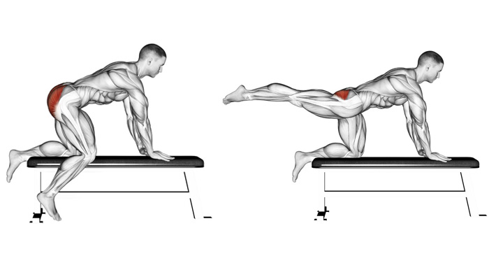 Махи ногами назад на горизонтальній лаві - за допомогою махів ви можете ефективно опрацювати задню, передню, зовнішню і внутрішню поверхню стегна, а також великі і середні сідничні м'язи. Грамотне використання цієї вправи допоможе вам досягти результатів в схудненні, підтягнути мускулатуру нижної частині тіла, зробити фігуру пружною і привабливою. Махи ногами назад призначені для опрацювання м'язів задньої поверхні стегна (біцепса стегна) і сідниць (великий сідничний м'яз). Причому, якщо ви робите махи прямою ногою, більшою мірою працює задня поверхня стегна і додатково включається поперек. Вправа абсолютно не вимоглива до інвентарю. Її легко можна виконувати вдома. При цьому ви можете або не використовувати додаткове обладнання взагалі, або закріпити на щиколотках вагу. Встаньте рівно і зіпріться руками в горизонтальну лаву або будь-яку іншу опору. Зафіксуйте поперек, під час виконання руху не повинно бути прогину в спині. Відведіть пряму ногу назад до максимально можливого рівня. Стопа при цьому скорочена, ви тягнетесь вгору п'ятою. Положення спини залишається незмінним, працює тільки сідниця і стегно. М'яко опустіть носок на підлогу. Положення упору на колінах і ліктях є більш ефективним з точки зору опрацювання м'язів. По-перше, амплітуда руху в тазостегновому суглобі в цьому випадку більша. По-друге ви можете робити махи як прямою ногою, так і зігнувши її в коліні, тим самим передаючи акцент навантаження на сідницю.