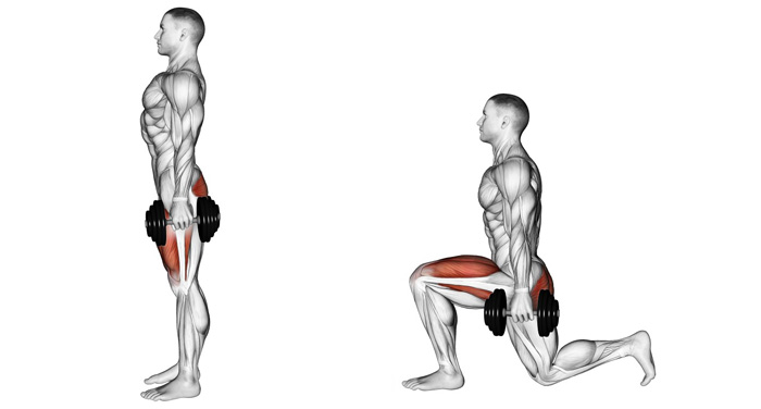 Випади з гантелями - по праву можна назвати однією з найефективніших базових вправ для розвитку мускулатури стегон і сідниць. У порівнянні з присіданнями, випади дозволяють сконцентрувати навантаження на одній нозі і пропрацювати м'язи більш ретельно. Використання гантелей як ваги дозволяє краще тримати рівновагу і робить навантаження на хребет нижче, ніж в разі випадів зі штангою. Які м'язи працюють під час виконання випадів з гантелями: квадріцепс (чотириглавий м'яз стегна, займає його передню поверхню) - одна з двох основних робочих груп. Цей м'яз розгинає ногу в колінному суглобі, коли ми піднімаємося з нижньої точки. Великий сідничний м'яз (становить основну масу сідниць) - поряд з квадріцепсом, отримує значне навантаження, розгинаючи стегно при підйомі вгору. Крім квадріцепсів і великих сідничних, участь в роботі беруть: м'язи пресу, середні сідничні, біцепси стегон, м'язи спини, литкові та ін. Основною функцією перерахованих м'язів в даній вправі є стабілізація становища корпусу і ніг. Випади з гантелями, як і будь-які інші види випадів, створюють підвищене навантаження на зв'язки колінних суглобів. В цьому плані вони травмонебезпечніші, ніж, скажімо, присідання. Це пояснюється тим, що під час присідань вага тіла і обтяження розподіляється на дві ноги, а роблячи випади, все навантаження ви зосереджує на одній нозі. Звичайно, м'язи від цього в захваті, але ось слабкі зв'язки можуть постраждати. Утримайтеся від виконання випадів з гантелями при наявності свіжих травм колін. Якщо травми були, але давно, робіть вправу вкрай обережно і при виникненні найменшого дискомфорту закінчуйте. Візьміть в руки гантелі і встаньте рівно. Стопи на ширині тазу, спина пряма, плечі розправлені, погляд спрямований вперед. Це вихідне положення. На вдиху зробіть робочою ногою крок вперед, перенесіть на неї вагу тіла і зігніть коліно. Намагайтеся ставити стопу м'яко і пружно, не падайте вперед всією вагою. Ширина кроку повинна бути такою, щоб коліно робочої ноги не виходило за проекцію носка. Кут в коліні робочої ноги дорівнює 90 градусів або трохи менше. Опорна нога стоїть на носку. На видиху, відштовхнувшись п'ятою робочої ноги від підлоги, поверніться назад у вихідне положення. Повторіть рух потрібну кількість разів. Кількість повторів і підходів залежить від ваших індивідуальних цілей: для набору маси ніг і сідниць робіть по 8-12 повторів кожною ногою в 3-4 підходу. Якщо ваша мета - жироспалювання і рельєф, робіть по 20-25 повторів, але з невеликою вагою і в більш швидкому темпі.