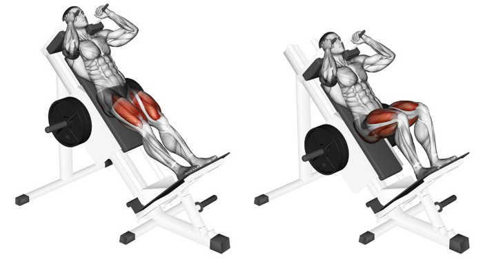 Жим ногами в станку - відмінна базова вправа для накачування ніг, яка виключає травму попереку. Це дуже хороша вправа у бодібілдингу, при якій спортсмен витискає вагу на спеціальному тренажері силою своїх ніг. Вправа по праву вважається базовою адже в ній беруть участь відразу кілька суглобів: тазостегновий, колінний і гомілковостопний. Взагалі жим ногами відмінно замінить присідання, але за умови, що нас цікавить тільки накачування ніг. Спину, на жаль, виконанням цієї вправи зміцнити не зможете. Виконання жиму ногами в тренажері виключить травми спини. Найбільше навантаження отримують такі групи м'язів: квадріцепси, сідничні м'язи, м'язи стегна, біцепси стегон. Сядьте в тренажер і поставте ступні на поверхню платформи повище і на ширині плечей. Ступні трохи розведіть назовні. Притисніться верхом спини і сідницями до спинки тренажера і не відривайте їх, поки не закінчите виконання вправи. Після цього зніміть фіксатор платформи і виштовхніть її вгору. У верхній точці руху ноги не потрібно випрямляти повністю, це загрожує травмою колін. Зробіть вдих і, затримавши подих, плавно опускайте платформу з вагою до грудей. Нижня точка руху - кут не більше 90 градусів в колінному суглобі, якщо більше, то відбувається відрив попереку від спинки тренажера, що загрожує травмою хребта. При досягненні нижньої точки руху, без паузи і як і раніше затримуючи дихання, потужно напружте м'язи стегон, але плавно виштовхуйте платформу вгору. Тільки після проходження «мертвої точки» зробіть видих. Не відривайте п'яти від платформи - це перевантажує колінні суглоби. Як правило, при жимі ногами можна взяти набагато більшу вагу, ніж під час присідання. Це, безумовно, добре позначиться на зростанні м'язової маси і сили ніг, але і про ризик травми при роботі з такими вагами не варто забувати.