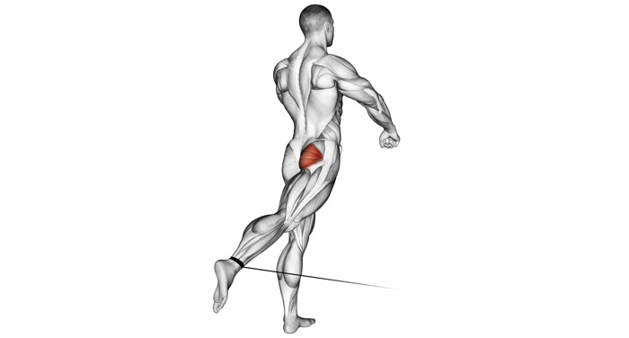 Відведення ноги назад в блочному тренажері (кросовер) - виконується за рахунок скорочення м'язів сідниць і задньої поверхні стегна. Махи в кросовері дозволяють максимально ефективно проробити область малого тазу. Серед переваг виконання махів назад в кросовері можна виділити наступні: вправа спрямована на опрацювання великих сідничних м'язів. Додатково задіюється мускулатура задньої поверхні стегна. Кросовер не фіксує траєкторію руху ноги і положення корпуса, тому крім цільових м'язів працюють м'язи стабілізатори. Ви можете регулювати рівень навантаження на сідничні м'язи не тільки за рахунок зміни ваги в тренажері, але змінюючи положення корпусу, згинаючи / розгинаючи робочу ногу. Дана вправа є ізольованою, в ідеалі, рух здійснюється тільки в тазостегновому суглобі. Відведення ніг назад можна виконувати як альтернативу присіданням при травмах колін, так як колінні суглоби вона не задіює або задіє мінімально (при згинанні робочої ноги). Відведення стегна назад - досить проста вправа, і її цілком під силу виконати навіть новачкам. Встаньте лицем до опори блочного тренажера. Закріпіть на тросі нижнього блоку манжету, яка дозволить вам закріпити трос на ступні або щиколотки. Протягніть ногу в манжету. Зручно візьміться руками за опору тренажера, зафіксуйте корпус. Таз повинен знаходитися строго над стопою опорної ноги. Злегка зігніть робочу ногу і зробіть мах назад. Пам'ятайте, що сідничні м'язи здатні відвести пряму ногу назад на 10-15 градусів від вертикальної лінії. Далі вже в роботу включаються м'язи спини. Тому якщо корпус ви тримаєте прямо, не відводьте ногу занадто далеко і не прогинайтеся. Не розгортайте стегно назовні, рух виконується строго назад. У верхній точці руху зробіть невелику паузу і опустіть ногу в початкове положення. За рахунок нахилу корпусу вперед ви можете регулювати амплітуду махів. Відповідно, чим нижче ви нахиляєтеся, тим амплітуда руху ноги буде більшою. Відповідно сідничний м'яз буде більше розтягуватися і працювати ефективніше. Не забувайте контролювати спину - природний прогин в попереку допускається, але не більше того. Вигинати спину не потрібно.