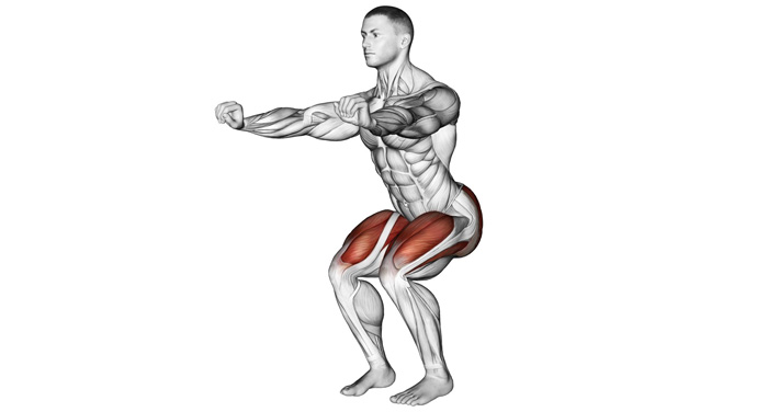 Присідання з витягнутими руками - вправа, яка підходить для людей, які хочуть навчитися присідати або займаються вдома. Таке положення рук є найоптимальнішим для початківців. Станьте прямо, ноги на ширині плечей, носки розведіть трохи в сторони. Втягніть живіт і прямі руки витягніть вперед, щоб вони були паралельні підлозі. У попереку зберігайте природний прогин і напруження, спина повинна бути прямою. Зігніть ноги в колінах і присядьте до горизонтального положення стегон. Навантаження повинно бути на середину стопи, спину тримайте рівною і нахиліться вперед рівно на стільки, щоб тримати рівновагу. Опускаючись вниз робіть вдих, а вгору - видих. Намагайтеся не завалюватися вперед, назад або на будь-яку ногу. Потрібно відразу відточити техніку, щоб присідати рівно. Якщо даний варіант вправи здасться вам легким, спробуйте присідати з руками за головою.