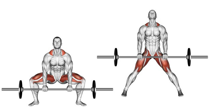 Присідання "сумо" з штангою перед собою - це базова вправа, яка виконується по техніці присідань зі штангою і їх найкраще чергувати між собою. Є основна відмінність - навантаження на спину тут мінімальне, зате навантаження на ноги зросло. Присідання в стилі сумо добре підходить для розвитку силових показників. Ноги ставте ширше ваших плечей, носки розведіть в сторони на 45 градусів. У спині легкий прогин і напруження попереку до кінця виконання вправи, живіт втягніть. Шия пряма і погляд спрямований вперед. Центр тяжіння знаходиться на середині стопи. Насамперед починає опускатися таз, робите вдих. Спина при цьому рівна, коліна розходяться в бік носків. Сідайте до паралелі стегон з підлогою. Якщо будете присідати нижче, пильно стежте за технікою. Як тільки досягли паралелі, починайте відразу підйом штанги вгору, видих, після важкої ділянки вправи. Коліна можна випрямляти не повністю, тоді буде постійне навантаження на ноги. Перед присіданнями особливу увагу приділіть розминці внутрішньої частини стегна. Якщо присідати нижче паралелі, будуть включатися в роботу сідниці. Присідайте до тих пір, поки коліна дивляться в сторони. Як тільки коліна почали сходитися, починайте вставати. Для тренування на силу, поставте стілець або лавку. Атлет повинен торкнутися сідницями поверхні і затриматися на пару секунд. Після чого починати підйом вгору. Якщо ви тільки освоюєте присідання сумо або вам важко виконувати, повторіть вправу без ваги, щоб уникнути травм, так як вона дуже сильно вантажить внутрішню частину стегна. Чим сильніше розгорнути носки і коліна в сторони, тим більше буде працювати внутрішня поверхня стегна.