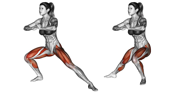 Бічні випади в сторону - одна з найбільш популярних вправ для стегон і сідниць. Існують різні варіанти цього руху, адаптовані для новачків і просунутих спортсменів. Бічні випади дозволяють додатково опрацювати внутрішню поверхню стегна і середні сідничні м'язи. Додатково працюють ікри, м'язи преса і поясниці. Окремо слід сказати про зовнішню поверхню стегна і зону галіфе. Часто випади убік застосовують з метою корекції цієї проблемної зони. Тут слід внести ясність. Жирові відкладення не зникають внаслідок тренування м'язів як такої. Для позбавлення від них необхідний дефіцит енергії, який, зокрема, можна створити інтенсивним тренуванням м'язів. Але на 70% успіх залежить від зниження калорійності харчування. Складність же впливу фізичними вправами на зону галіфе обумовлена ще й тим, що зовнішня поверхня стегна є не м'яз, а сухожилля, поверх якого як раз і знаходиться жир. Випади в бік виконуються з положення стоячи, ноги на ширині плечей. Трохи розведіть носки в сторони і випрямте спину. Можете зігнути руки в ліктях перед грудьми, помістити долоні на пояс або витягнути їх уздовж тулуба - як вам буде зручніше. Напружте прес. Коліна м'які, стійка пружиниста. На вдиху зробіть широкий крок лівою ногою в сторону. Робоче коліно трохи згинаєте, м'яко опускаєте стопу на підлогу, переносите на цю ногу центр ваги і присідаєте до прямого кута в коліні. Намагайтеся тримати спину рівно. Допускається лише легкий нахил вперед. Друга нога при цьому абсолютно пряма - витягнута в сторону. На видиху енергійно розігніть коліно і поверніться у вихідне положення. Ви повинні відчувати, як працюють сідниці і квадріцепс. Зробіть потрібну кількість повторень кожної ногою.