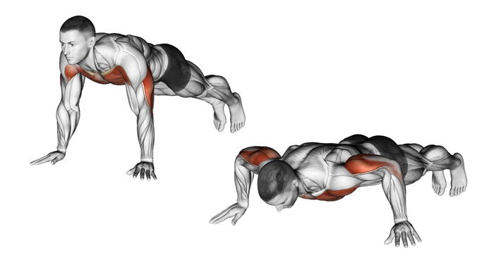 Віджимання від підлоги - базова, багатосуглобна вправа, що виконується на підлозі. Основні задіяні м'язи - грудні й трицепси. Побічно навантажуються передні пучки дельт, передпліччя, дрібні м'язи кисті, м'язи низу спини, прес і квадрицепси. По суті, віджимання - це жим лежачи навпаки. Похилий жим головою вгору стимулює верх грудних, а головою вниз - низ. З віджиманнями по іншому. Типовий варіант: голова вище ніг, в результаті чого більше навантажується нижня область, а ось коли ступні знаходяться на опорі і "голова нижче ніг", працює верх грудних. Віджимання від підлоги з широкою постановкою рук діють на зовнішні області грудних. Однак помічено, що найсильніший ефект дають віджимання, коли широко розставлені кисті і ступні стоять на високій опорі. За рахунок цього в початковому положенні ви опускаєтеся нижче звичайного і розтягує грудні. Таке розтягнення дозволяє вкрай швидко підкреслити зовнішні кордони грудних м'язів. Якщо ви качаєте груди раз в тиждень, спочатку додайте тільки одне домашнє тренування і спостерігайте за собою. Якщо перебору з навантаженням не відчувається, додайте друге, а потім і третє. Потренуйтеся в такому режимі 3-4 тижні, потім поверніться на початок - до одного додаткового домашнього тренування.
