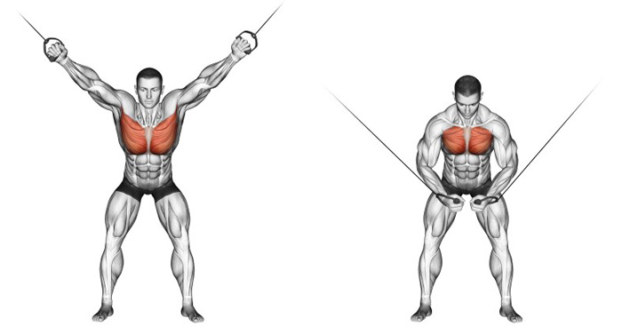 «Кросовер» - зведення рук на блокових тренажерах - ця вправа є ізолюючою, цілеспрямовано розвиває внутрішні і нижні пучки грудних м'язів, а другорядне навантаження лягає на дельтовидні м'язи і трицепси. Виконується зазвичай на додаток до жиму штанги або гантелей лежачи, або до іншої базової вправи для м'язів грудей. Візьміть ручки тренажера обома руками і станьте в центрі тренажера. Трохи нахиліть тулуб вперед. Злегка зігніть руки в ліктях і, притягнувши ручки до себе, з'єднайте їх перед грудьми. Повільно поверніться у вихідне положення. Повторюйте рух до завершення підходу. Техніка кросоверів така ж, як техніка розводок на лаві. Тримайте руки трохи зігнутими протягом усього підходу. Руки перед грудьми описують півколо. Повністю скорочуйте м'язи грудей в кінцевій точці руху. Добре розтягуйте м'язи в нижній точці. Не випрямляйте руки під час розтяжки, зберігайте напруженість грудних м'язів протягом всього підходу. Виконуйте вправу правильно і ритмічно, стежте за технікою і диханням.