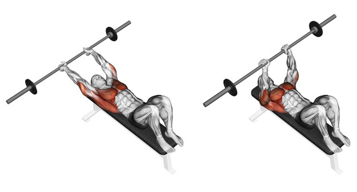 Жим штанги на похилій лаві - одна з кращих вправ для пророблення верхніх грудних м'язів. У більшості спортивних залів похилі лави зазвичай встановлені занадто високо - під кутом 45-60°. Ідеально було б встановлювати лаву під кутом в 15-35°. У жимах на похилій лаві основне навантаження несуть м'язи верху грудей і передні дельти. Найчастіше тренування на груди в тренажерному залі починають з жиму лежачи, а вже пізніше переходять до жимів в нахилі, але настав час покінчити з цією поганою звичкою. Час від часу починайте практикувати жим в похилій лаві. Перевага буде полягати в тому, що ви зможете вижимати більшу вагу і, як наслідок, краще проробляти верхні грудні м'язи. Розмістіться на лаві, поставте підошви ніг ширше плечей і упріться ногами в підлогу. Стегна, плечі і голова щільно прилягають до лави. Візьміться за гриф штанги, положення рук - зверху грифа. Відстань між кистями - трохи більше ширини плечей (ширина хвату така ж, як при жимі на горизонтальній лаві). Вдихніть і затримайте дихання, повільно опустіть штангу до верхнього фрагменту грудних м'язів. Доторкніться до них штангою. На видиху вичавіть штангу вгору. Освойте правильну техніку виконання рухів, перш ніж збільшувати вагу. Уникайте задіювання сили інерції, застосовуйте повільний контрольований рух, не сутультесь. Тримайте груди pозправлені, а лопатки опущеними вниз. Робіть видих при піднятті штанги. Тримайте ступні ніг широко розставленими на підлозі для забезпечення стабільності.