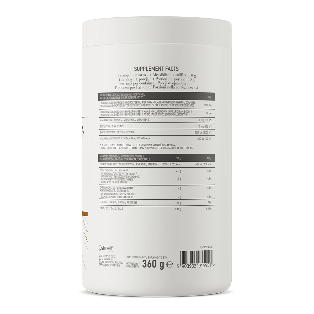 OstroVit Beauty Blend Hair & Skin – комплексна дієтична добавка, яка є джерелом білка, а також містить колаген, гіалуронову кислоту, вітамін С, вітамін А, цинк і біотин. Добавка із вишуканим смаком ванілі, доступний у зручній формі порошку. Це продукт без додавання цукру, який ідеально доповнить раціон людей, які піклуються про здоровий і красивий вигляд.