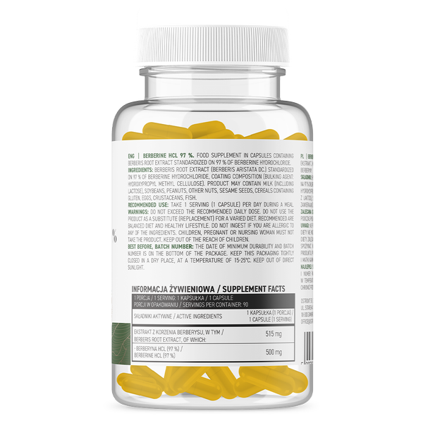 OstroVit Berberine засіб який робить більш ефективним весь процес тренувань. Берберин - це алкалоїд, що входить до складу багатьох рослин, які використовуються в традиційній китайській медицині. Позитивно впливає на функцію кишечника і регуляцію кишкової оболонки. Берберин вживають через його протизапальний і антидіабетичний вплив. Більш того, він може благотворно впливати на шлунково-кишковий тракт і знижувати рівень холестерину в крові. Берберин може знижувати рівень глюкози, яку виробляє печінка. Може взаємодіяти з антидепресантами і сприяти спалюванню жиру. Основний механізм дії берберина частково відповідає за антидіабетичну і протизапальну дію.