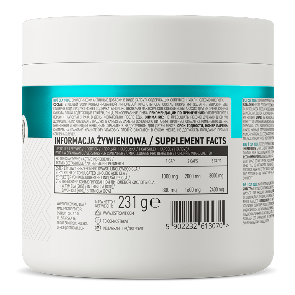 OstroVit CLA 1000 біологічно активна добавка високої якості на основі лінолевої кислоти (CLA). Натуральна речовина, яка представляє собою набір жирних кислот. Жирні кислоти, що входять до складу, містять кілька незамінних елементів, необхідних людському організму для повноцінної життєдіяльності. OstroVit CLA 1000 призначений для фізично активних людей, які прагнуть знизити масу тіла або застосовують дієту.