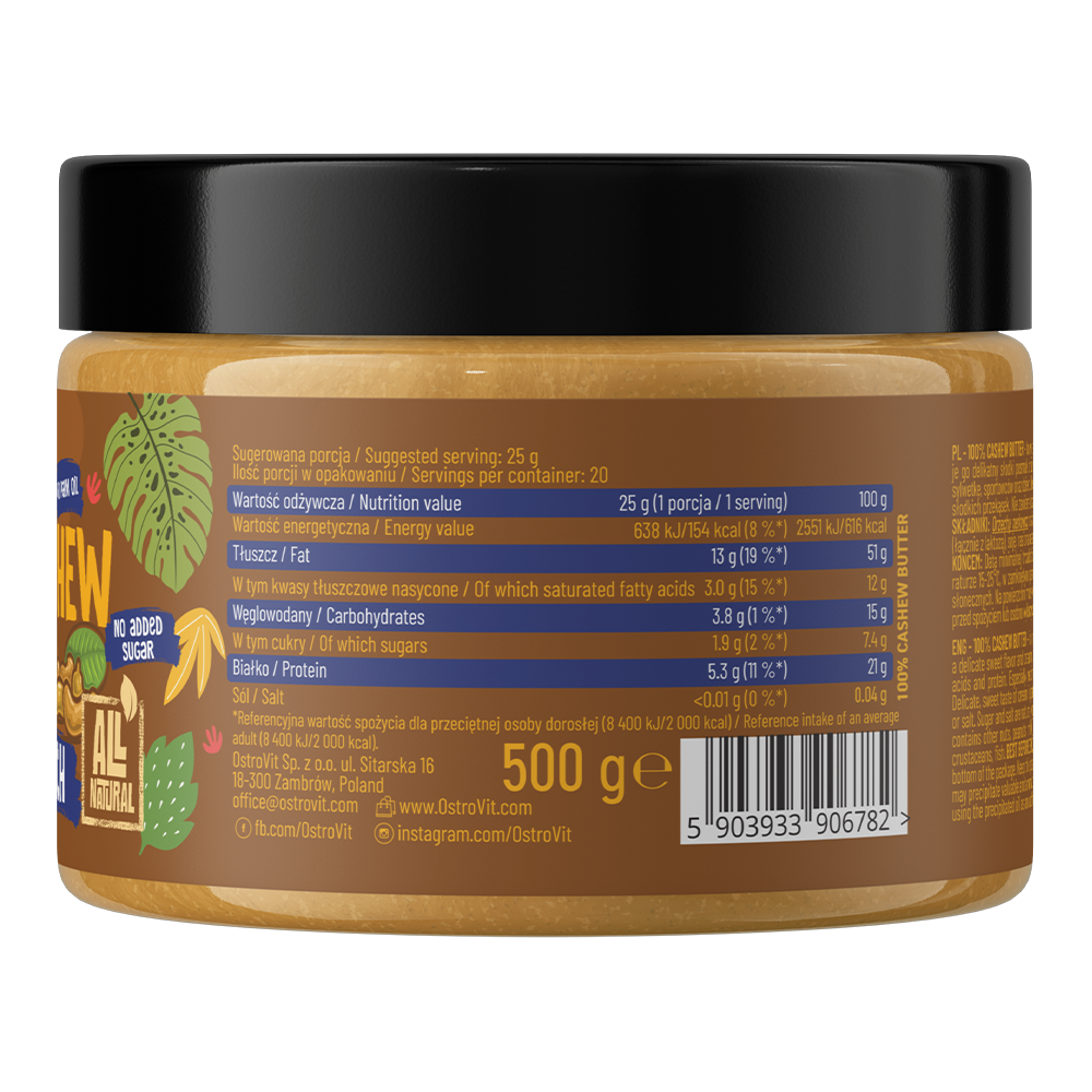 Відмінне масло із горіхів кеш'ю, цей продукт виготовлений для спортсменів, які хочуть обмежити споживання цукру і солі у своєму раціоні. Він містить цінні жирні кислоти. Цей десерт робить фантастичним природний аромат та солодкість кеш'ю масла. Продукт включає в себе дієтичне волокно, а також невеликі кількості калію, заліза і марганцю. Він не містить штучних барвників, ароматизаторів та консервантів. Він містить хороші жири, необхідні для здорового харчування.