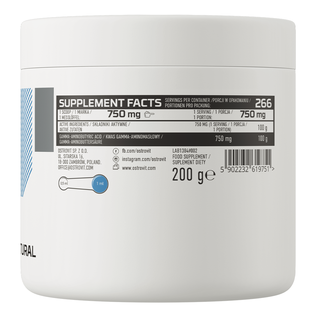 OstroVit GABA (гамма-аміномасляна кислота, ГАМК) — це спеціалізована дієтична добавка у порошковій формі. Містить концентровану порцію гамма-аміномасляної кислоти. Через підсилення природних механізмів, що відповідають за правильний процес сну, допомагає організму підтримувати рівновагу та ефективну регенерацію. В організмі ГАМК утворюється з глутамінової кислоти за участю вітаміну B6. Відновлює енергетичні й метаболічні процеси в головному мозку, покращує динаміку нервових процесів, кровопостачання мозку, сприяє утилізації глюкози та виведенню токсичних продуктів обміну.