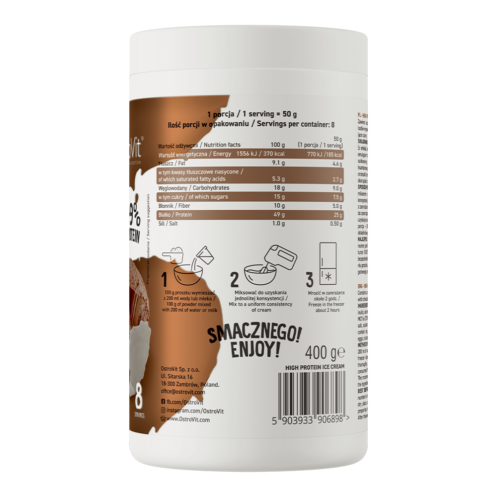 У складі використовується ізомальтулоза – вуглевод, що складається з глюкози і фруктози та природно зустрічається, зокрема, в меді. Вона сприяє розщепленню жирів при фізичних навантаженнях і вважається цінним замінником цукру. На відміну від звичайного цукру, ізомальтулоза не перетворюється під дією бактерій у ротовій порожнині на кислоти, що руйнують зубну емаль. OstroVit High Protein Ice Cream розроблений спеціально для фізично активних людей, які піклуються про струнку фігуру або перебувають на дієті. Десерт стане чудовою альтернативою традиційним солодощам із мінімальною калорійністю.