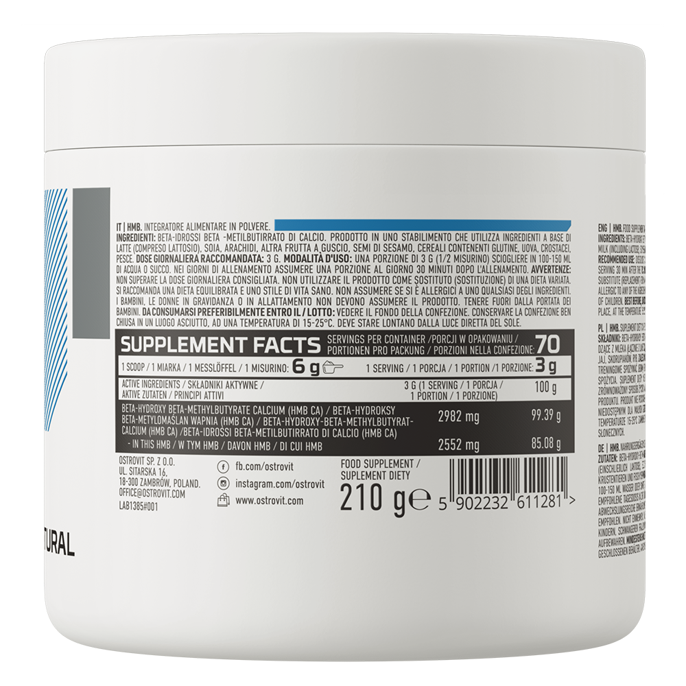OstroVit HMB – продукт, який служить джерелом високоякісного HMB (гідроксіметилбутірату). Гідроксіметилбутірат або HMB – це органічна кислота, яка утворюється в організмі людини внаслідок розщеплення амінокислоти лейцину, що входить до складу BCAA. Лейцин міститься у високих концентраціях у м’язовій тканині. Під час силових тренувань мікропошкодження м’язів призводить до руйнування лейцину, а отже – до підвищення рівня HMB. Спортивні добавки, що містять HMB, позитивно впливають на анаболічні та антикатаболічні процеси в організмі.