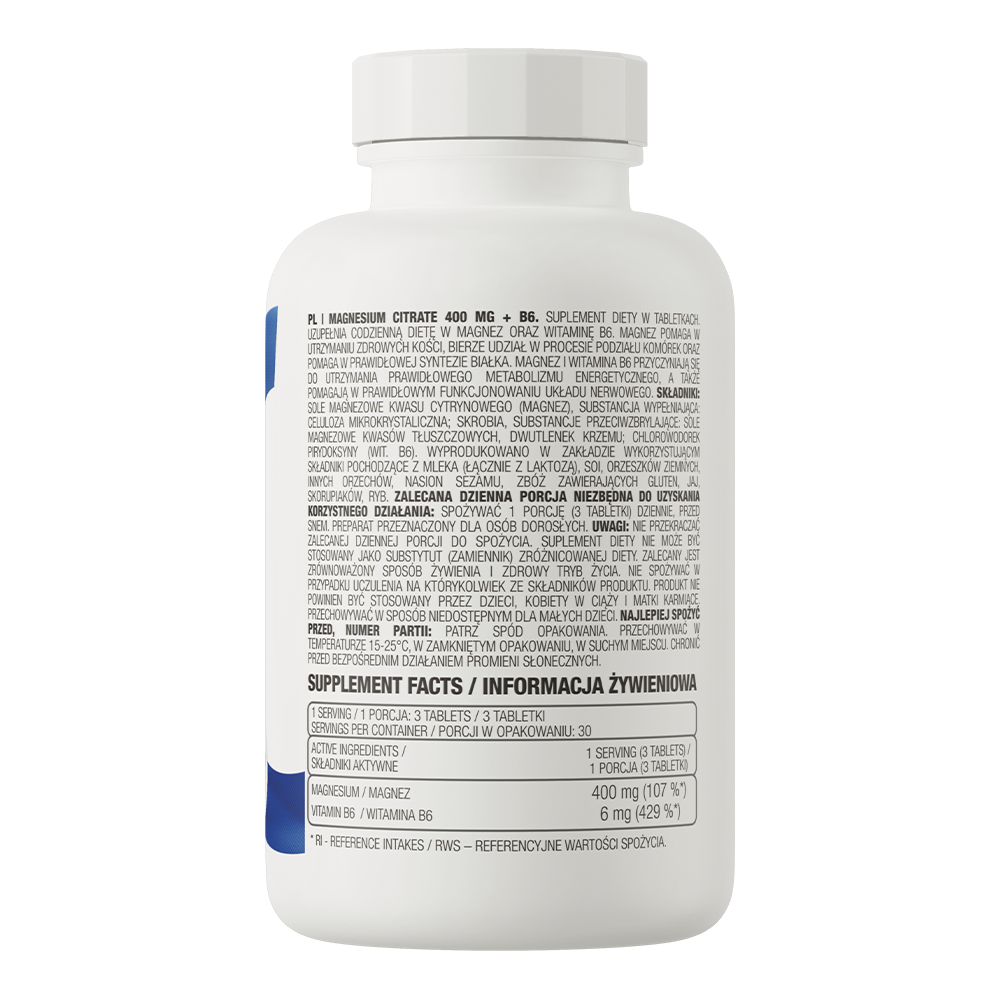 Magnesium Citrate 400 mg + B6 - це сучасна дієтична добавка, призначена для активних людей, які хочуть підтримувати оптимальне функціонування організму. Містить легкозасвоювану форму магнію та вітаміну В6. Створений для людей, які шукають всебічної підтримки здорових м’язів та кісток - особливо при підвищеній фізичній чи розумовій активності.