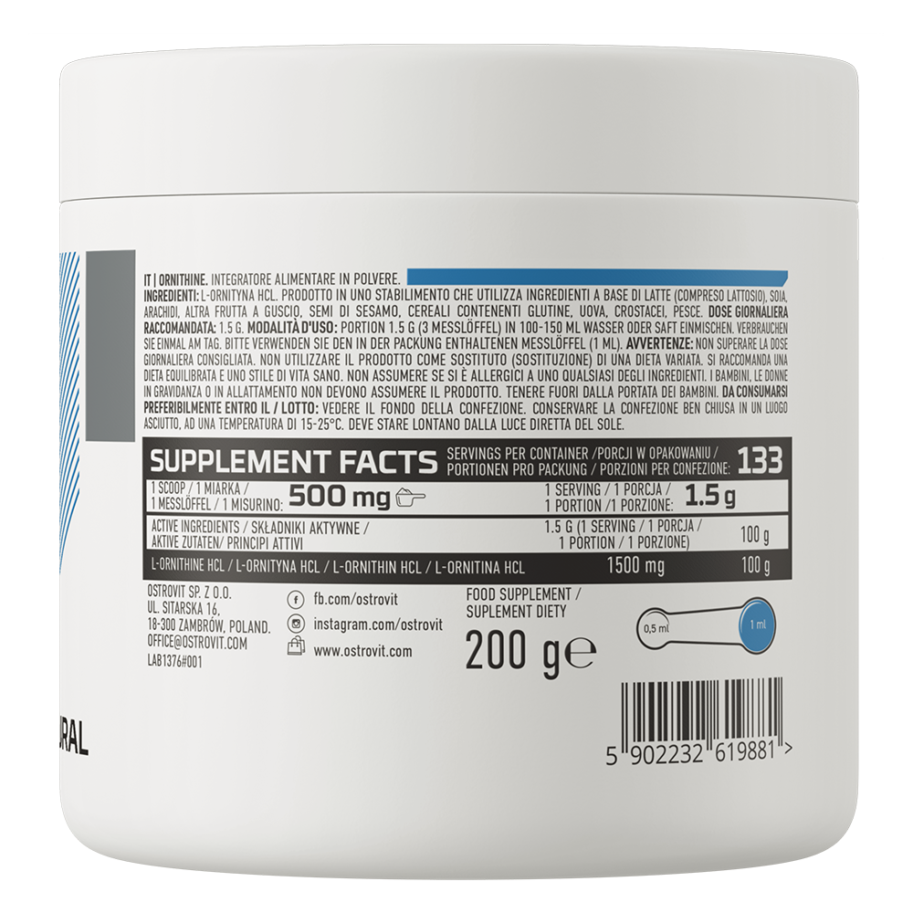 OstroVit Ornithine добавка, яка містить тільки одну речовину L-орнітин, інші непотрібні наповнювачі, такі як консерванти і аромати, були спеціально виключені з виробництва. Його мікронізація була розроблена з найвищим рівнем фармацевтичної фрагментації. Добавка забезпечує ідеальну біодоступність і розчинність.