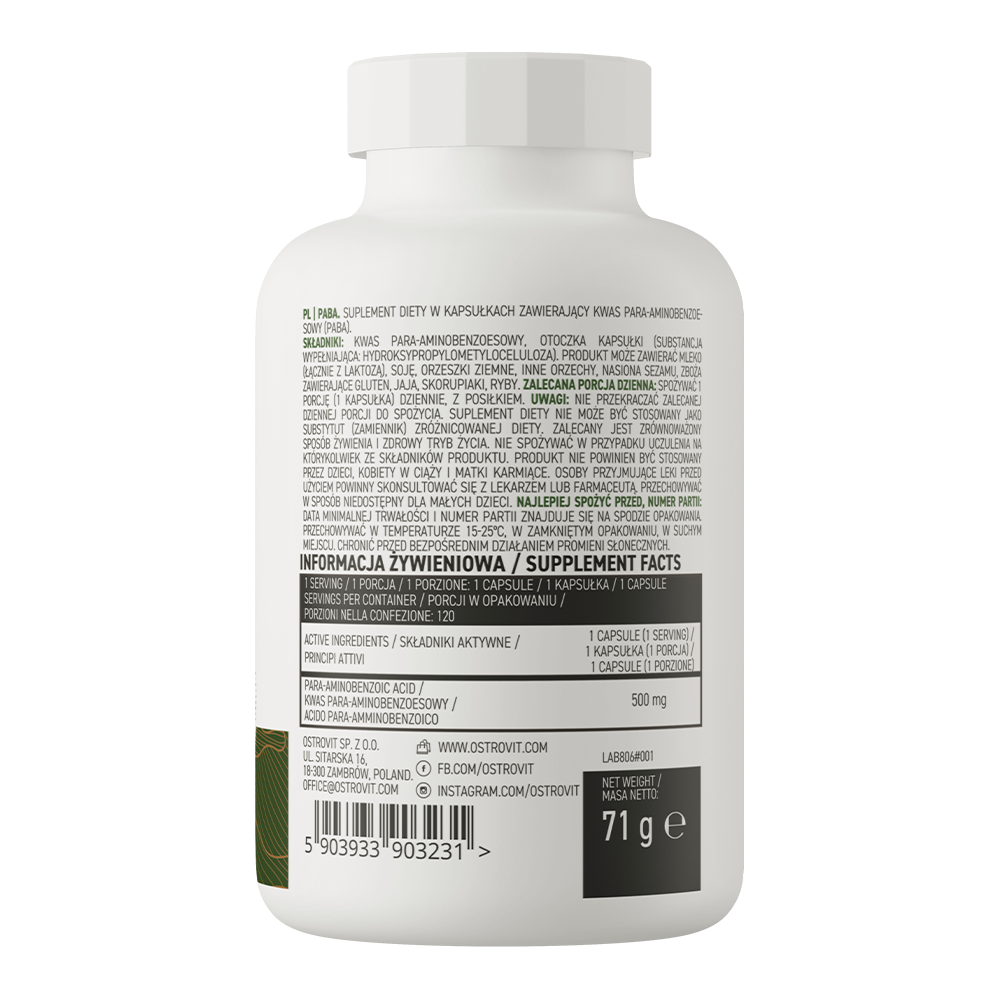 OstroVit PABA - дієтична добавка в капсулах з дуже широким ефектом для здоров'я. Пара-амінобензойна кислота, що використовується у продукті, також відома як вітамін В10, підтримує виробництво та засвоєння багатьох цінних поживних речовин, включаючи фолієву кислоту та інші вітаміни групи В. Ви шукаєте добавку, яка уповільнить процес старіння, захистить вашу шкіру від шкідливого УФ-випромінювання та покращить засвоєння вітамінів і мінералів в організмі? У цьому вам обов’язково допоможуть капсули OstroVit PABA.