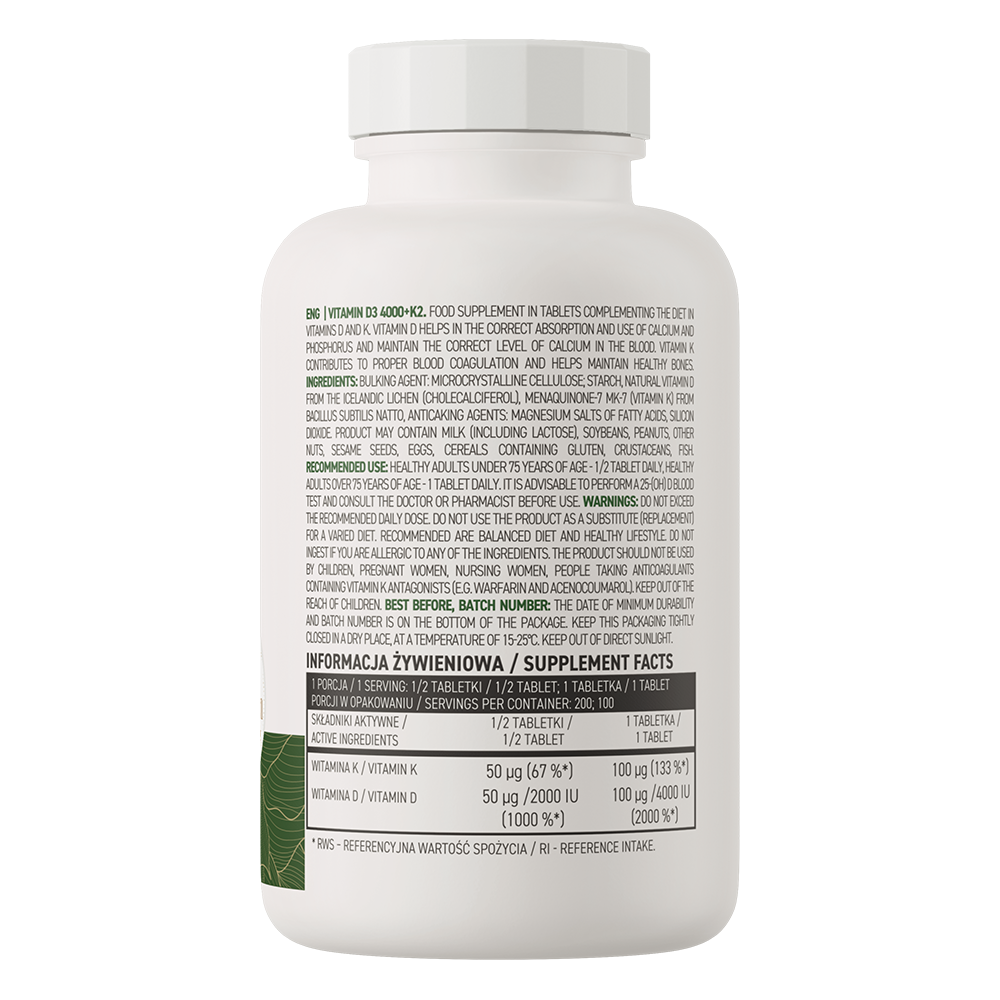 OstroVit Вітамін D3 4000 + К2 являє собою поєднання вітамінів, отриманих з натуральної сировини. Вітамін К2 є необхідним для нормального функціонування організму, регулює згортання крові, а також впливає на підтримку нормальної мінеральної щільності кісткової тканини. Відповідає за належне транспортування кальцію з крові в кісткову тканину, що дозволяє підтримувати здорові і міцні кістки, а також збільшити їх стійкість до переломів.