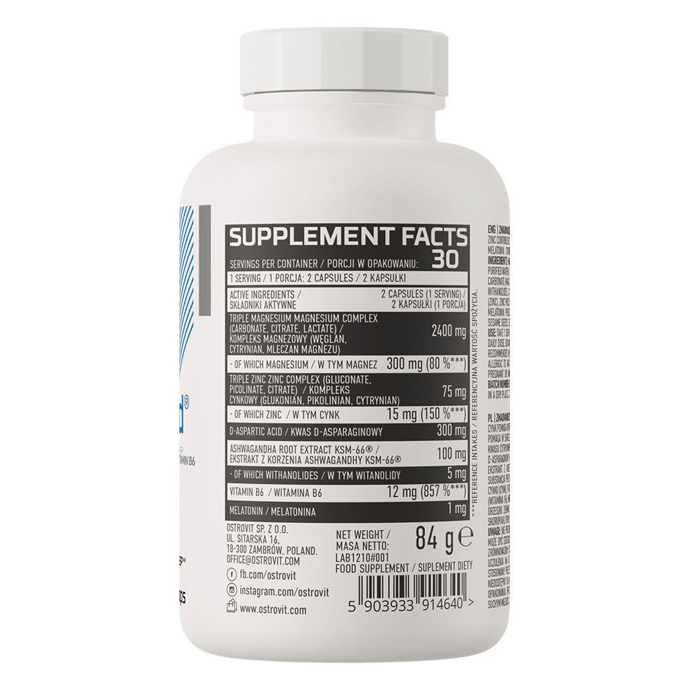 магнієві солі лимонної кислоти (магній), D-аспарагінова кислота (DAA), лактат магнію (магній), карбонат магнію (магній), екстракт кореня ашвагандхи KSM-66 Ashwagandha® (стандартизований до 5% вітанолідів), глюконат цинку (цинк), піколінат цинку (цинк), піридоксаль-5'-фосфат (вітамін B6), цитрат цинку (цинк), мелатонін, магнієві солі жирних кислот, оболонка капсули (желатин, вода очищена).